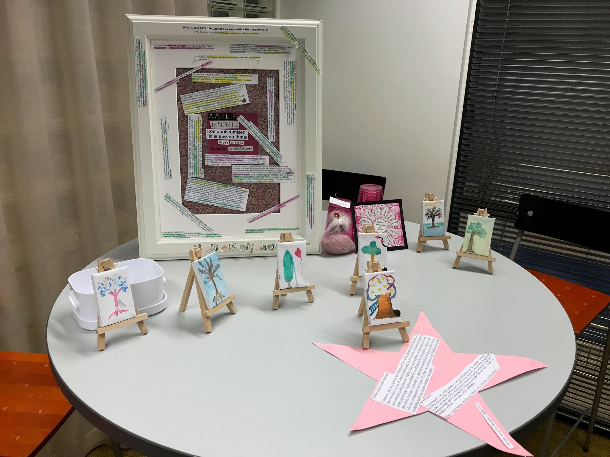 Parhautta tällaiset koulutukset – Aika meni nopeasti, huomaamatta – On vastannut odotuksia – Positiivinen ja avoin ilmapiiri – Virkistynyt – Innostunut – Runsas ja rento olo – Pohdiskeleva – Pohtiva – Rauhallinen – Kokeilunhaluinen – Kiinnostunut – Uusia ideoita – Odottava – Rauhallisuus – Mukavaa intoa – Käyttökelpoista materiaalia – Motivoitunut – Iloinen – Hyvin matskua, nyt prosessoimaan – Varma ohjaus – tuki, selkeys – visio, tiedän, luotan – Aikomus oppia lisää teoriaa ja käsitteita – Uusia ideoita – Tyytyväinen – Innostus – Tärinä – Antoisa – Innostus – Uusia monipuolisia työtapoja – Intoa opon työhön, Kiitos! – Antoisa päivä – Mukavaa tulla uudelleen!
